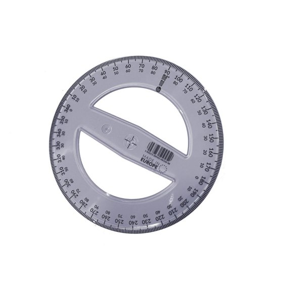 Przezroczysty kątomierz 180 stopni. Kątomierz charakteryzuje się nieścieralnymi podziałkami i precyzyjnym nadrukiem skali (do 1/1000 cm). Produkt ma zaokrąglone rogi dla bezpieczeństwa użytkownika. Wykonana z polistyrenu o odpowiednim stosunku twardości do elastyczności zapewniającym wysoką odporność na złamania. Wyprodukowany zgodnie z europejskiminormami.
