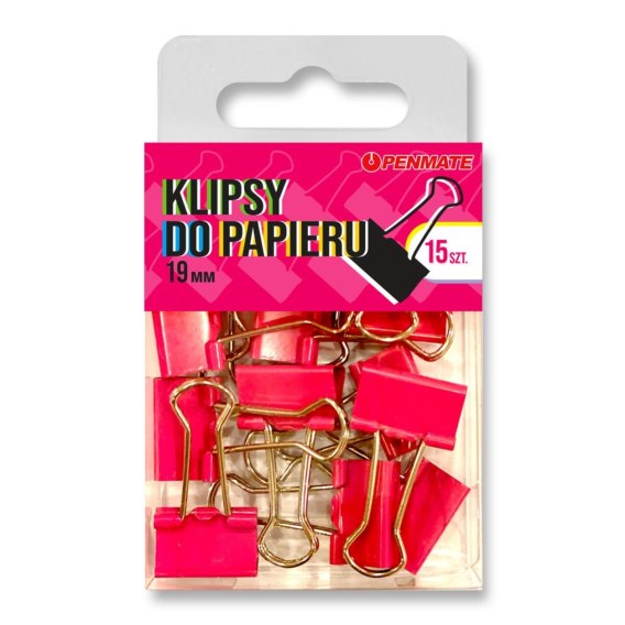Kolorowe klipsy do papieru o wymiarze 19 mm. Wykonane z nierdzewnej stali zapewniającej wysoką sprężystość. Praktyczne opakowanie z zawieszką zawierające 15 szt. klipsów w jednym kolorze.