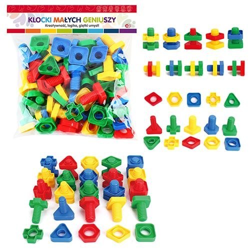 Edukacyjne klocki figury geometryczne oraz śrubki Fantastyczne, unikatowe klocki rozwijające wyobraźnię oraz postrzeganie przestrzenne dziecka. 50 elementów w 4 kolorach, które można wykorzystać na różne sposoby. Można ćwiczyć rękę przy przykręcaniu figur do śrubek, można dopasowywać kształty figur do kształtu śrubek, można także uczyć się nazw poszczególnych figur oraz kolorów.Wiek: 3+ Wymiary opakowania: 30 x 7.2 x 35 cm .