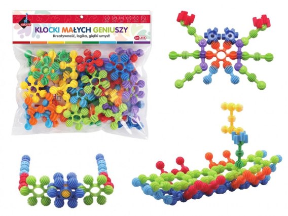 54 klocki w 8 kolorach pozwalają stworzyć fantastyczne, przestrzenne figury, zaczynając od tych prostych takich jak cyferki czy okulary poprzez nieco trudniejszego kraba lub statek.
