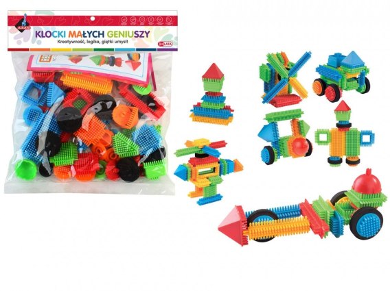 Zestaw składa się z 46 kolorowych klocków- jeżyków, które umożliwiają tworzenie różnorodnych figur, pojazdów, przedmiotów i postaci. Komplet klocków rozwinie wyobraźnię przestrzenną, a także pobudzi zdolności motoryczne dzieci. Opakowanie wyprodukowano w Polsce. Wymiary opakowania: 30x5x35 cm. Wiek: 3+