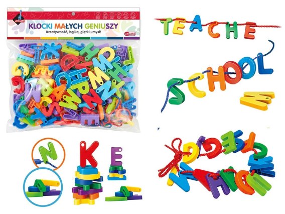 Edukacyjne klocki literki Zestaw kolorowych literek ze sznurkiem do nawlekania. Twórz słowa i zdania a także wiszące napisy. 140 elementów w 8 kolorach pozwala uczyć się słów na wesoło. wymiary opakowania:31x5x27 cm Zabawka przeznaczona dla dzieci 3+