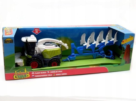 Kombajn z przyczepą w skali o napędzie frykcyjnym. Pojazd posiada efekty dźwiękowe i świetlen. Opony wykonane z plastiku. Zabawka przeznaczona dla dzieci powyżej 3 roku życia.