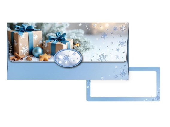 Koperta podarunkowa. Wewnątrz znajduje się ozdobna karteczka, na której można napisać życzenia. Każda koperta jest zapakowana osobno w folię z zawieszką euro.