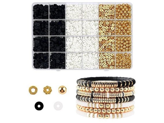 Zestaw do robienia bransoletek, koraliki czarne, białe, złote, aplikacje, sznurki; Box