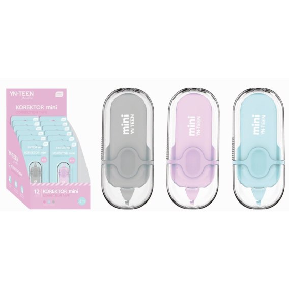 Korektor w taśmie w wersji mini w trzech pastelowych kolorach: szarym, jasnoróżowym i miętowym. Długość taśmy: 6 m. Mały, stylowy i poręczny, zmieści się w każdym piórniku. Doskonale kryje.