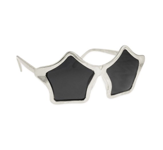 OKULARY GWIAZDKI SREBRNE Wysokość: 7 cm Długość: 16 cm Okulary w kształcie złotych gwiazd z czarnymi szkłami.