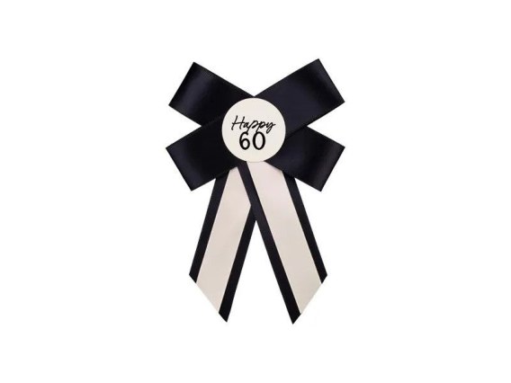 Kotylion na 60 urodziny w kolorze kremowo-czarnym, wymiary ok. 11 x 17 cm. Kotylion wyposażony jest w agrafkę.