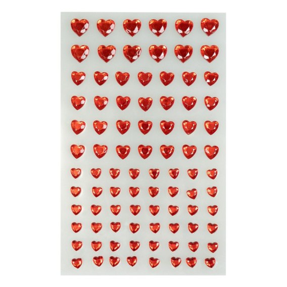 Dekoracyjne kryształki w kształcie serduszek. Ozdobne diamenciki samoprzylepne w kolorze czerwonym, mix rozmiarów do prac kreatywnych, szkolnych, dekoracji kartek urodzinowych, zaproszeń, albumów ze zdjęciami, przedmiotów. 84 sztuki na blistrze o wymiarze 12 cm x 25 cm.