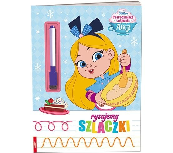Czarodziejska cukiernia Alicji. Rysujemy Szlaczki Alicja zaprasza do krainy szlaczków! W towarzystwie swoich ulubionych bohaterów z animacji najmłodsi będą ćwiczyć kreślenie szlaczków i rysowanie różnorodnych kształtów. Będzie to dla nich nie tylko wspaniała zabawa, ale też doskonały trening umiejętności manualnych przygotowujący do nauki pisania liter i cyfr. Dzięki specjalnym stronom i ścieralnemu mazakowi w każdej chwili dzieci mogą zacząć przygodę ze szlaczkami od nowa. Dodatkową atrakcją są wesołe rymowanki na temat ulubionych postaci.