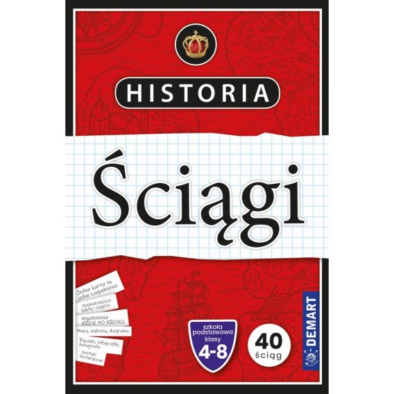 40 ściąg obejmuje wszystkie najważniejsze zagadnienia omawiane na lekcjach historii na tym poziomie edukacyjnym. Format ściąg jest dostosowany do wielkości zeszytów – po prostu się w nim mieszczą. Dla wygody uczniów przygotowujących się do klasówek i testów na JEDNEJ ŚCIĄDZE przedstawiono JEDNO ZAGADNIENIE.
