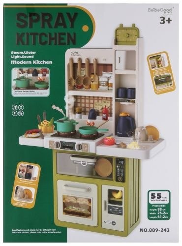 Zalety produktu: posiada efekty dźwiękowe oraz świetlne, płyta wydaje odgłosy gotowania, kurki do sterowania kuchenką są ruchome, zlew posiada kran z którego leje się woda, kuchnia posiada otwierane drzwi piekarnika oraz zmywarki, składa się z 55 elementów. Kuchnia MEGA CREATIVE to propozycja ciekawej i wciągającej zabawy dla dzieci, które chętnie naśladują zajęcia dorosłych i w bezpieczny sposób mogą bawić się w małych kucharzy. Ciekawy i nowoczesny design, a także ładna i żywa kolorystyka to tylko niektóre cechy tej kuchni! Zawartość zestawu: kuchnia, garnek z pokrywką, patelnia, nóż kuchenny, sztućce kuchenne, czajnik,3 x talerze, artykuły spożywcze oraz inne akcesoria kuchenne. Całość wykonana z plastiku oraz kartonu. Wymiary/waga/baterie: wymiary produktu (dł. x wys. x gł.) [cm]: 61x88x26, wymiary opakowania (dł. x wys. x gł.) [cm]: 45x62x17, waga produktu bez opakowania [kg]: 1,05 kg, waga produktu w opakowaniu [kg]: 2,73 kg, wymaga zasilania bateriami x AALR06- nie załączono do zestawu. Zabawka przeznaczona dla dzieci w wieku: 3+. Pakowana w karton. W kartonie zbiorczym po 6 szt.