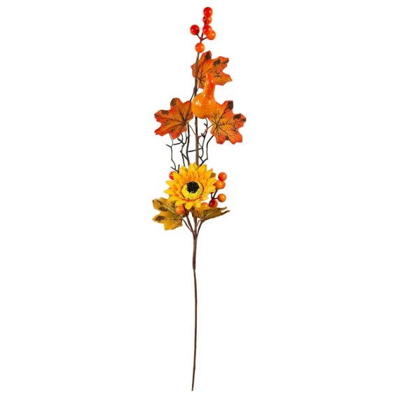 Jesienna gałązka dekoracyjna. Bogata kompozycja złożona z imitacji liści klonu, kwiatu słonecznika, dyni oraz jesiennych owoców. Ozdoba do wykorzystania pojedynczo lub jako wypełnienie kompozycji dekoracyjnych, stroików oraz sztucznych kompozycji kwiatowych. Gałązka o długości 65 cm.