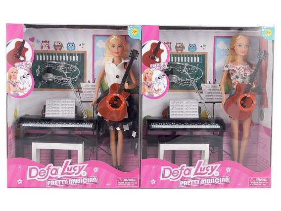 Lalka 29cm z zestawem instrumentów muzycznych, pianino, gitara; 32x25x7cm, W/B