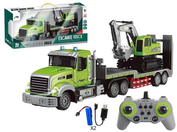 Auto z lawetą i koparką 1:12 na radio, 11 funkcji, z akum. I ładowarką; 60x11x20cm, W/B