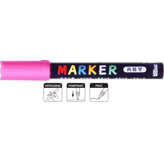 Marker akrylowy; Do zdobienia i malowania na większości powierzchniach, takich jak: drewno, tektura, papier, płótno, szkło, guma, plastik, stal, kamień, płótno, styropian; Wodoodporny i szybkoschnący; Bardzo odporny na światło słoneczne, charakteryzuje się wysoką przyczepnością do podłoża; Grubość kreski 1-2 mm; Dostępny w 30 kolorach; 6 szt. w opak.; 180 szt. w displayu (30 kolorów po 6 szt.)