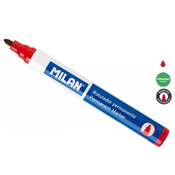 Czerwone permanentne markery z okrągłą końcówką o średnicy 4 mm. Tworzą trwałe ślady na większości materiałów. Odporna końcówka, która jest w stanie wytrzymać uderzenia i silny nacisk. Nie odkształca się z upływem czasu. Tusz na bazie alkoholu. Zalecane: zakryć końcówkę po użyciu skuwką i przechowywać w pozycji poziomej. Rozmiar markera: 14,7 x ø 1,7 cm.