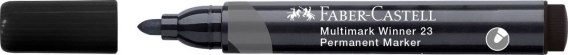 Marker permanentny Multimark Winner 23 Faber-Castell w kolorze czarnym. Wodoodporny, odporny na działanie światła i szybkoschnący. Z tuszem na bazie alkoholu, idealny do niemal wszystkich powierzchni np. drewno, metal, szkło, plastik i karton. Okrągła końcówka pisząca. Ze skuwką i końcówką w kolorze tuszu. Obudowa markera wykonana w 68% z plastiku z recyklingu.
