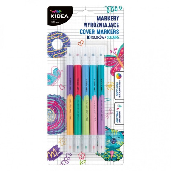 Markery wyróżniające Kidea. Każdy marker posiada dwie końcówki: jedną cienką do precyzyjnych linii i szczegółów, a drugą grubszą, bazową do wypełniania obszarów i tworzenia efektownego, kolorowego tła. Dzięki możliwości użycia jednego koloru na drugim możesz wykreować niezwykle precyzyjne kształty i puścić wodze fantazji. Kolory się nie rozmazują i ładnie się nawzajem kryją, dzięki czemu można kłaść wiele warstw markerów na sobie uzyskując niepowtarzalny i dokładny efekt.