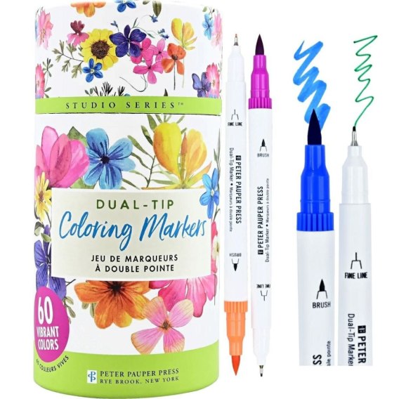 Duży zestaw markerów dwustronnych Dual-Tip Peter Pauper Press to 60 kolorowych mazaków - każdy z nich ma końcówkę pędzelkową typu Brush do dużych powierzchni oraz końcówkę precyzyjną Fine 0,4 mm do prac szczegółowych. Użyjesz ich do rysowania, pisania, kolorowania i wszystkich prac kreatywnych. Tusz na bazie wody jest odporny na blaknięcie i nie zawiera kwasów. Wytrzymałe pudełko w kształcie tuby ma przezroczyste wieczko i zapewnia bezpieczne i uporządkowane przechowywanie markerów - dzięki temu można je wszędzie zabrać ze sobą. Zestaw tych markerów to świetny pomysł na prezent. Wymiary pudełka 19 x 9,5 cm, długość 1 markera - 15,7 cm.