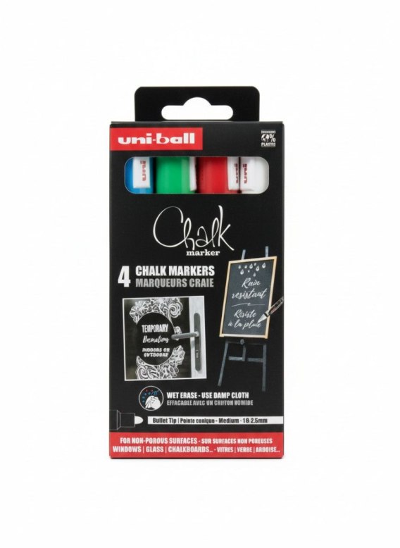 Zestaw 4 szt. markerów kredowych Chalk PWE-5M w kolorach: biały, czerwony, fluo zielony, jasno - niebieski.