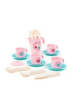 W zestawie: talerze, kubeczki, sztućce, dzbanek.