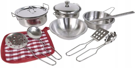 Zestaw metalowych naczyń i akcesoriów kuchennych 13 częściowy zestaw naczyń w pudełeczku z okienkiem