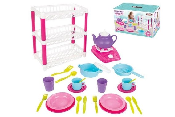 Zestaw kuchenny z suszarką. W zestawie: suszarka do naczyń trzypoziomowa, kuchenka, czajnik, garnek, patelnia, pokrywka, 2 miseczki, 2 duże talerzyki, 2 małe talerzyki, 2 kubki, 2 szklanki, 2 zestawy sztućców, akcesoria kuchenne.