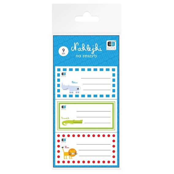 Zestaw 9 naklejek na zeszyty z podobiznami zwierzaków B&B z miejscem na podpis.