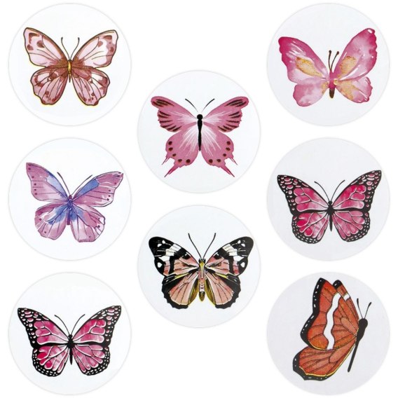 Naklejki papierowe na taśmie, 7 wzorów - motyle, mix, średnica 25 mm, szerokość taśmy 28 mm. 500 sztuk.