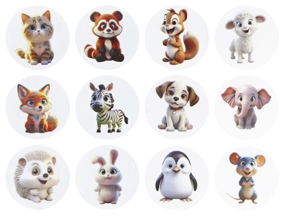 Naklejki papierowe na taśmie, 12 wzorów, średnica 25 mm, słodkie zwierzątka, szerokość taśmy 28 mm. 500 sztuk.