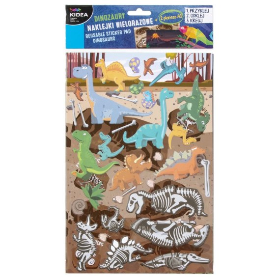 Poznaj nasze wielorazowe naklejki! Zapraszamy do świata prehistorycznych dinozaurów i wykopalisk. Dopasuj, przyklejaj, odklejaj oraz twórz własne opowieści. Zestaw zawiera aż 27 naklejek 3D i różne scenerie. Jakiego dinozaura dzisiaj spotkasz? A może pobawisz się w antropologa i dopasujesz szkielety do odpowiednich nazw? Możliwości jest naprawdę wiele! Nasze wielorazowe naklejki idealnie sprawdzą się jako prezent oraz pomysł na kreatywne spędzenie czasu. Niezwykle łatwe w użyciu, dzięki czemu można kształtować wyobraźnię razem z KIDEA już od najmłodszych lat!