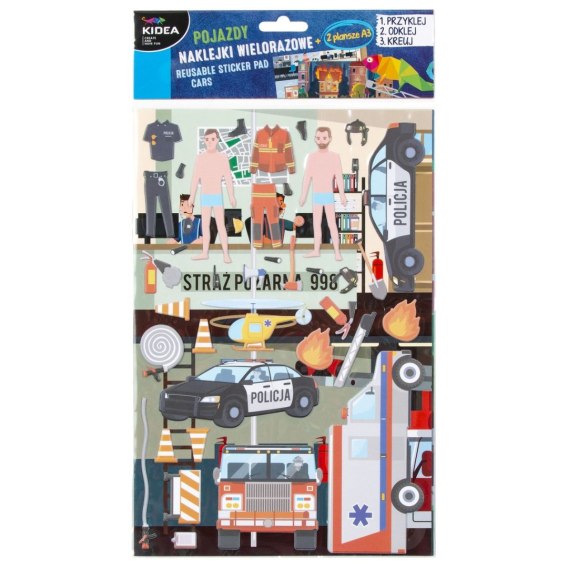 Poznaj nasze wielorazowe naklejki! Zapraszamy do świata policjantów i straży pożarnej. Ubieraj, przebieraj, dobieraj dodatki oraz twórz własne opowieści. Zestaw zawiera aż 37 naklejek 3D i 3 różne scenerie. Jaką historię dziś stworzysz? Pościg policyjny czy może gaszenie pożaru w fabryce czekolady? Jakie tło dobierzesz? Możliwości jest naprawdę wiele! Nasze wielorazowe naklejki idealnie sprawdzą się jako prezent oraz pomysł na kreatywne spędzenie czasu. Niezwykle łatwe w użyciu, dzięki czemu można kształtować wyobraźnię razem z KIDEA już od najmłodszych lat!