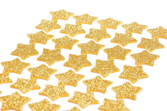 Brokatowe złote naklejki wykonane z pianki w kształcie gwiazdek. Dają efekt elementów wypukłych na dekorowanej powierzchni. Idealne do kartek świątecznych, zimowych dekoracji, prac szkolnych, zabaw kreatywnych i DIY.
