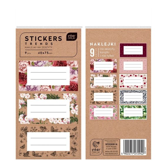 Zestaw 9 naklejek na zeszyty z miejscem na podpis.