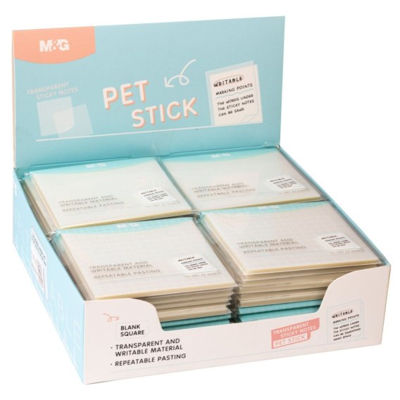 Karteczki transparentne typu sticky note gładkie lub w kratkę. Do wielokrotnego przyklejania i odklejania, z mocnym klejem. Do pisania ołówkiem, zakreślaczem, cienkopisem, pisakiem