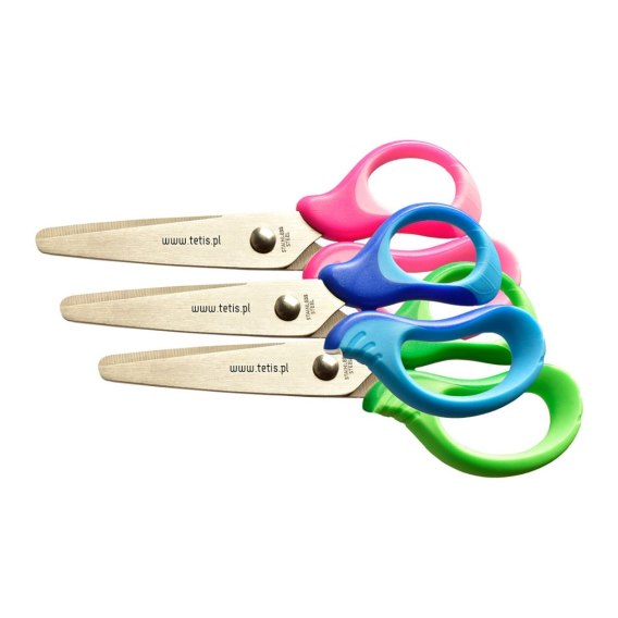 Nożyczki szkolne (5"/127 mm) ze stali nierdzewnej z zaokrąglonymi końcówkami. Elastyczny uchwyt dopasowany do dziecięcej dłoni.