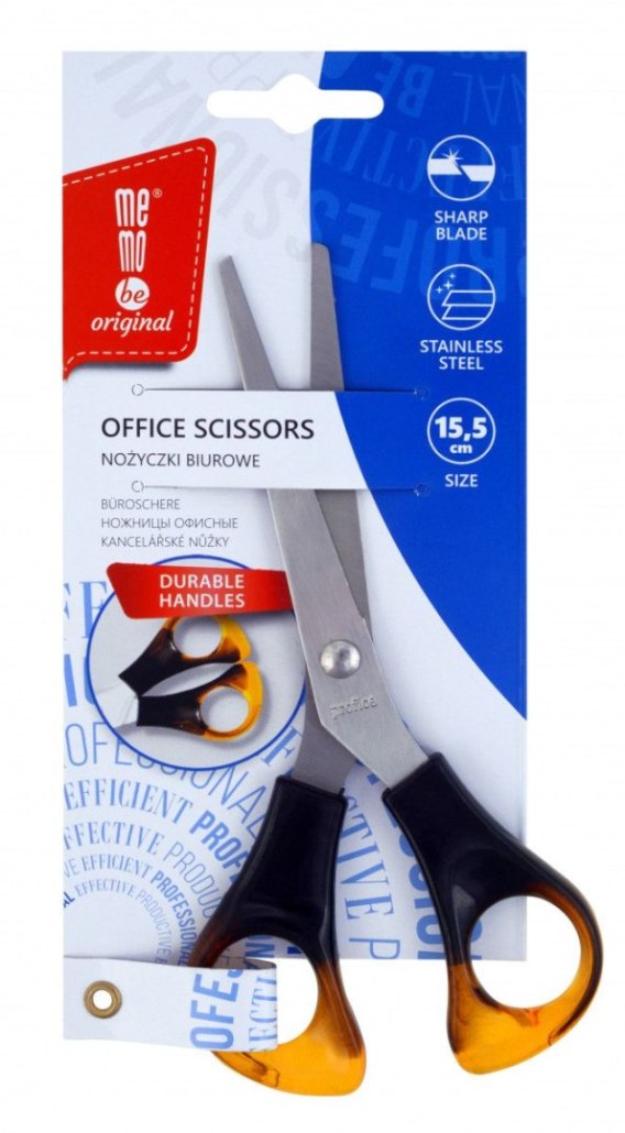 Nożyczki biurowe MemoBe z bursztynowymi uchwytami, których ergonomiczny kształt gwarantuje komfort podczas użytkowania. Dobrze wyprofilowane ostrza tną doskonale każdy rodzaj papieru. Produkt wykonany ze stali nierdzewnej z połyskiem. Pakowane w opakowania typu TRY-ME z zawieszką.