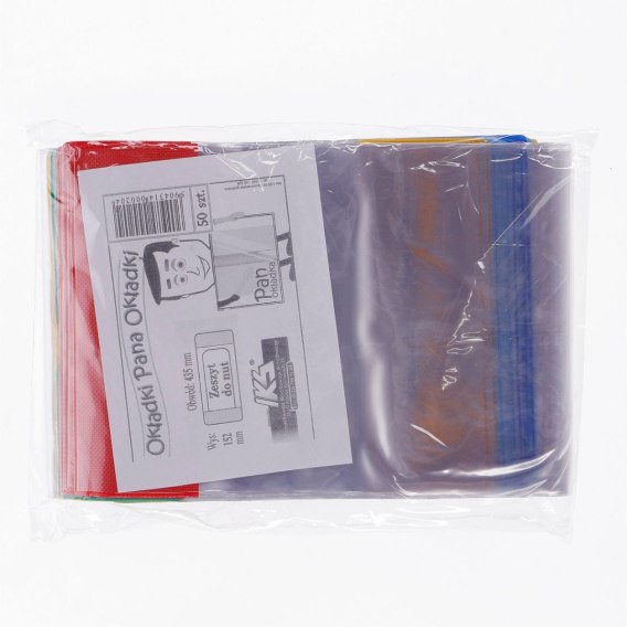 Okładki na Zeszyt do Nut, Wys. 152 mm Obwód 435 mm Wykonane z wysoko przeźroczystej folii o grubości 0,12 mm, paski w boczne 6 kolorach (mix). Opakowanie sprzedażowe zawiera 50 szt. Każda okładka z nadrukowanym kodem kreskowym