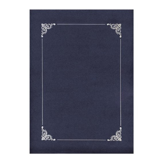 Teczka ozdobna, teczka 220 x 308mm, gładki karton ze złotą ramką, cztery wewnętrzne narożniki w rogach przytrzymują arkusz papieru A4, opakowanie 10 sztuk, kolor granatowy,