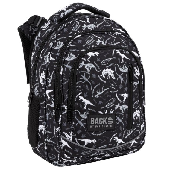 Wykopaliska, szkielety dinozaurów, komary zachowane w bursztynie, pradawne rośliny. Niezwykle fascynujący świat skamielin nie ma przed Tobą tajemnic, mógłbyś zawstydzić niejednego paleontologa. Skomplikowane nazwy jak triceratops, stegosaurus, pachycephalosaurus, pteranodon, elasmosaurus nie brzmią wcale tajemniczo. Szacuneczek! Mamy w takim razie propozycję, przyjrzyj się tym szkieletom. Myślisz, że wszystko się zgadza? Sprawdź nas! Odcienie czerni, szarości i bieli to doskonała propozycja dla każdego chłopca zafascynowanego światem wymarłych gadów. Plecak BackUP posiada: