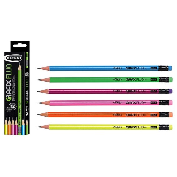 Ołówki GRAFIX z kolorową gumką Fibracolor * lakierowane w 6-ciu neonowych kolorach * drewno wysokiej jakości o bardzo dobrej strugalności * grafit HB = 2 wysokiej jakości, odporny na kruszenie i pękanie * gumka w kolorze obudowy odpowienio dobrana do grafitu o wysokiej skuteczności mazania * do uniwersalnych zastosowań : rysunków, szkiców, grafik, etc. Opakowane : pudełko firmowe z zawieszką 12 szt. ( 6 x 2 szt. z każdego koloru ). Producent : Fibracolor, Włochy