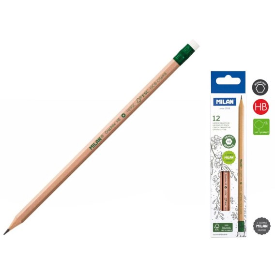 Ołówki sześciokątne HB z gumką o średnicy grafitu: 2,2 mm. Grafit HB jest średnio twardy, dzięki czemu nadaje się do pisania i rysowania. Naturalne drewniane wykończenie. Posiadają unikalny system Lead Protection System (LPS), który zwiększa odporność grafitu na złamania poprzez przyklejenie go do drewna. Drewno jest wytrzymałe i miękkie umożliwiając łatwe temperowanie. Drewno w 100% pochodzi ze zrównoważonych plantacji z certyfikatem FSC (Forest Stewardship Council). Wymiary ołówka: 19 x ø 0,7 cm.