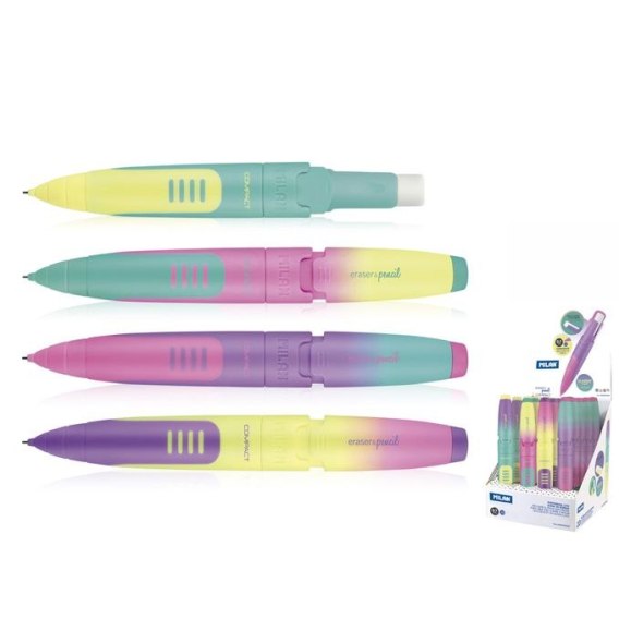 Ołówki automatyczne z grafitem 2B 0,7 mm z obudową w kolorach tęczy. Grafit 2B jest miękki dzięki czemu idealnie nadaje się do pisania i rysowania artystycznego. Na końcu pod obudową duża gumka do wymazywania. Ołówek o pogrubionym kształcie, ułatwiający uchwyt, szczególnie polecany młodszym dzieciom. Dostępne w 4 tęczowych kolorach: żółtym, fioletowym, różowym i turkusowym. Oryginalny produkt stworzony przez własny dział badawczo-rozwojowy MILAN. Wymiary ołówka: 13 x 1,8 x 1,6 cm. Dostępne zapasowe gumki i rysiki.