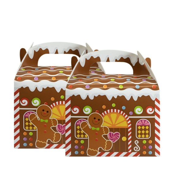 Papierowe domki - pudełko na upominki (2 szt.) to praktyczne i efektowne opakowania w kształcie świątecznych chatek. Kolorowy nadruk z motywem piernikowego ludzika, cukierków i ozdobnych detali nadaje im wyjątkowego charakteru, a wygodna rączka ułatwia przenoszenie. To doskonały sposób, aby w oryginalny sposób zapakować drobiazgi lub prezenty świąteczne.