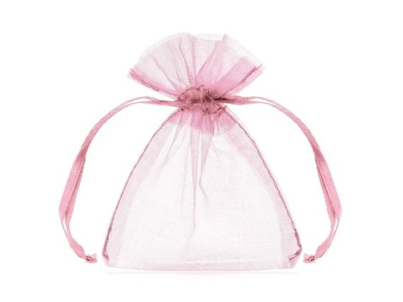 Ściągane woreczki z gładkiej organzy w kolorze różowym, wymiary ok. 7.5 x 10 cm. Idealne dla gości weselnych.