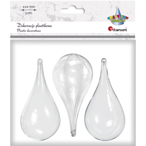Plastikowe dekoracje 3D z przezroczystego plastiku, składające się z dwóch części, z uchwytem umożliwiającym zawieszenie za pomocą wstążki, sznurka lub haczyka. Można je dowolnie malować i oklejać, zarówno wewnątrz jak i na zewnątrz lub użyć jako bazy pod bombkę wykonaną na szydełku. Idealne do tworzenia ozdób na różne okazje jak: Boże Narodzenie, Wielkanoc, chrzciny czy wesela. Jedne z najpopularniejszych elementów wykorzystywanych w technice decoupage. Kształt: kropla. Wymiary: szerokość w najszerszym miejscu: 54mm, wysokość wewnątrz: 100mm, wysokość z zawieszką: 110mm.