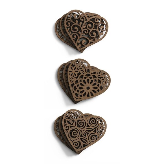 Ozdoby drewniane AŻUROWE SERCA, 9 sztuk pojedynczych dekoracji w opakowaniu, W zestawie 3 różne wzory, Półprodukty dekoracyjne dla rękodzieła, Doskonałe do zdobienia,
