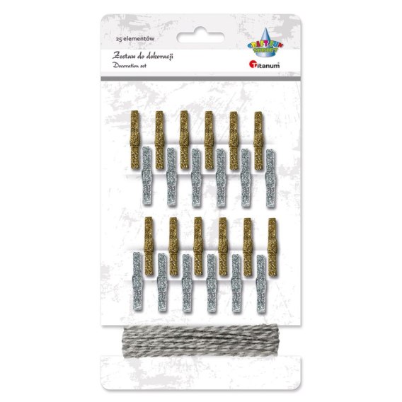 Drewniane klamerki do przypinania fotografii, karnecików przy prezentach, winietek na stół, dekorowania stroików, bukietów, doniczek, kartek okolicznościowych. Doskonałe uzupełnienie dla techniki scrapbookingu. Brokatowe. Kolory: srebrne, złote. Wymiary klamerki: 4x30mm. W blistrze 24 klamerki i sznurek ok. 360 cm. Kolor: złoty/srebrny.