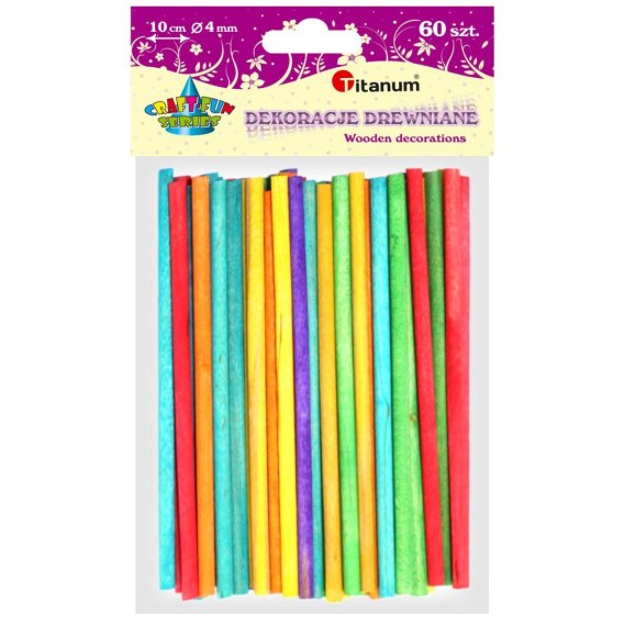 Drewniane patyczki do dekorowania, okrągłe, wykonane z naturalnego drewna, malowane, można je dowolnie zdobić: malować, oklejać, lakierować. Wymiary: długość 10 cm, średnica 4 mm, miks kolorów. 60 szt.